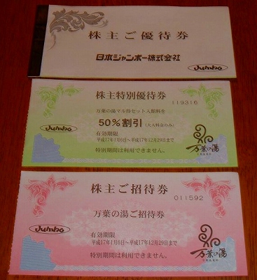 日本ジャンボーの株主優待は100株以上 万葉の湯招待券3枚、50%割引券5枚なんです。過去に株主優待券を使って東京・湯河原温泉 万葉の湯(町田市)に行ったことがあり、湯河原から源泉をタンクローリーで運んでくる面白い温泉だなあと思っていました。今年6月25日、横浜みなとみらいに新規オープンするのをずっと楽しみにしていましたが、やっときのう家族で行ったところ、受付で優待券は使えません、ただいま検討中です。とのことで、大人2620円、子供1470円(家族4人8180円)を払うはめになりました。ロケーションはよく、いろいろ楽しめたのですが、株主優待生活的には、優待が受けられないとんでもない事件でした。どこにも使えないとは書いてありませんでしたからね・・・また、行きたいと思っていますので、例外なく使えるようにしていただきたいですね。それが、できたらお勧めの銘柄と言えますが・・・